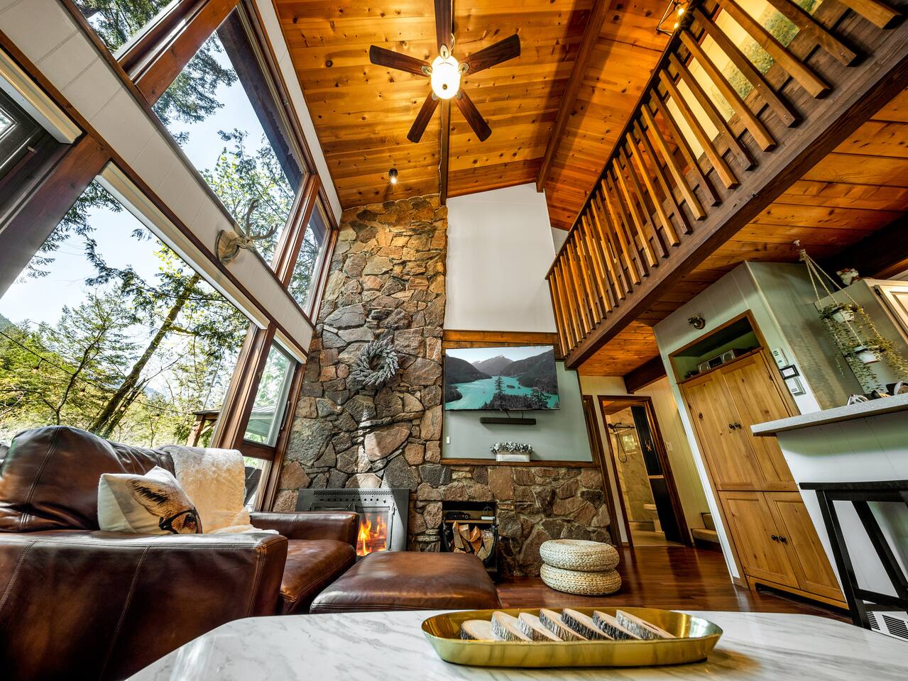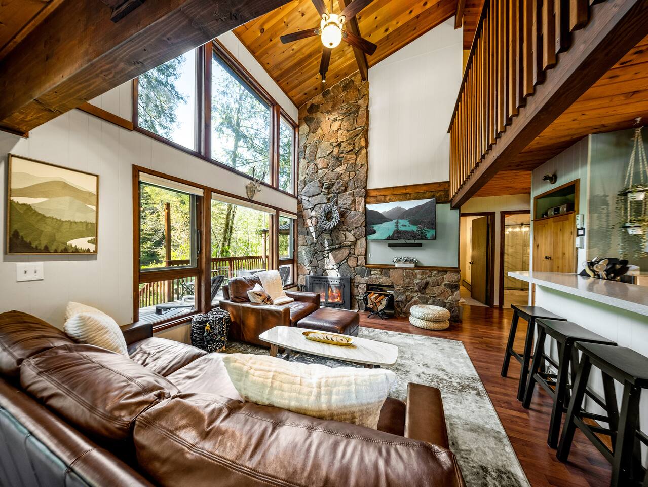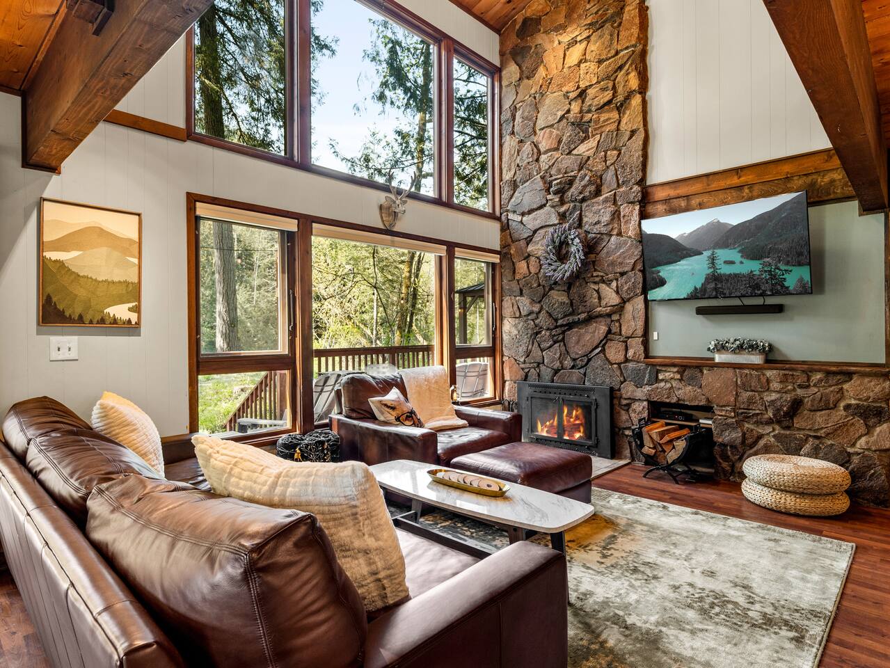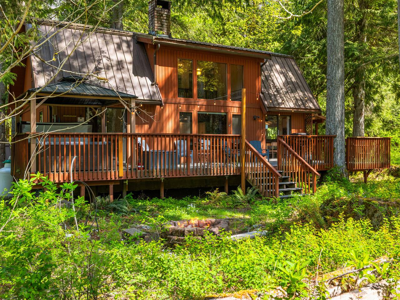 Make lifetime memories at Fox Haven! Riverfront cabin with large 2 story river view windows, vaulted ceilings, deck w/ covered hot tub + BBQ, 2 King beds, gig internet! Sleeping 7 guests comfortably, this cabin is ideal for all seasons: hiking, fishing, rafting, 25 min to skiing/snowboarding at Stevens Pass. Or relax by the river. This beautiful, pet-friendly home is the perfect North Cascades destination for your next vacation, or ideal remote work getaway!